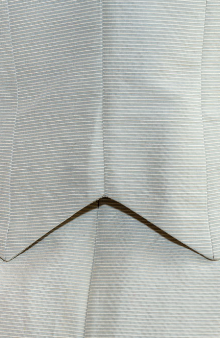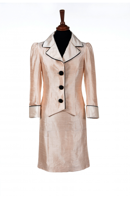 Neat, fitted suit with piped lapels and slightly ruched shoulders.