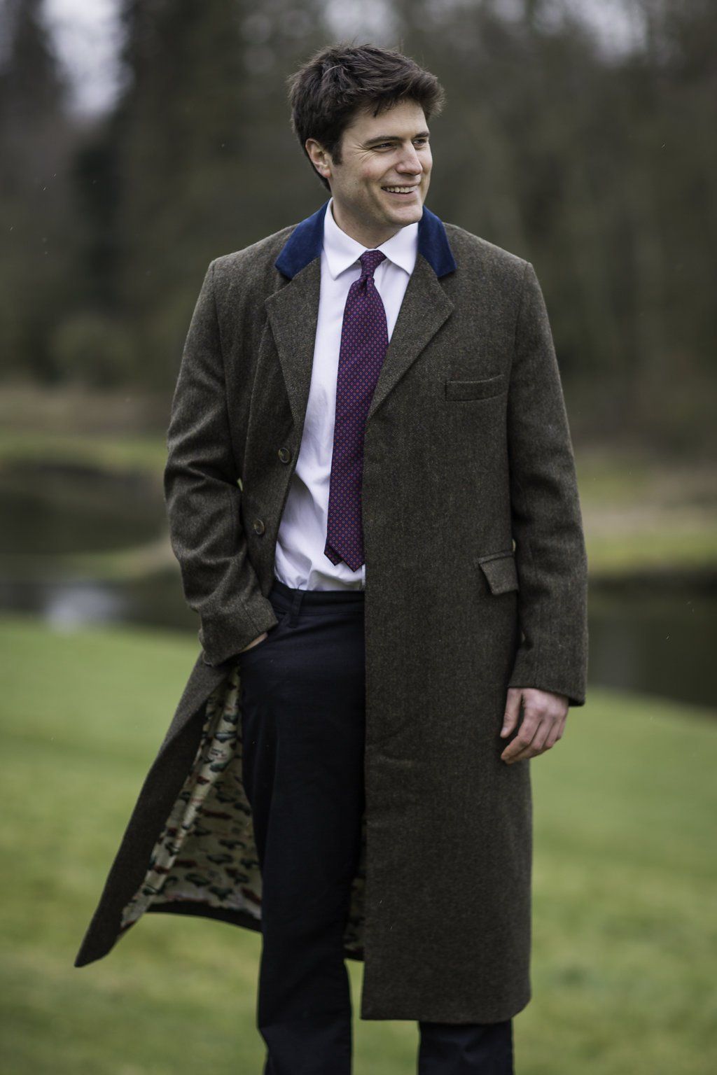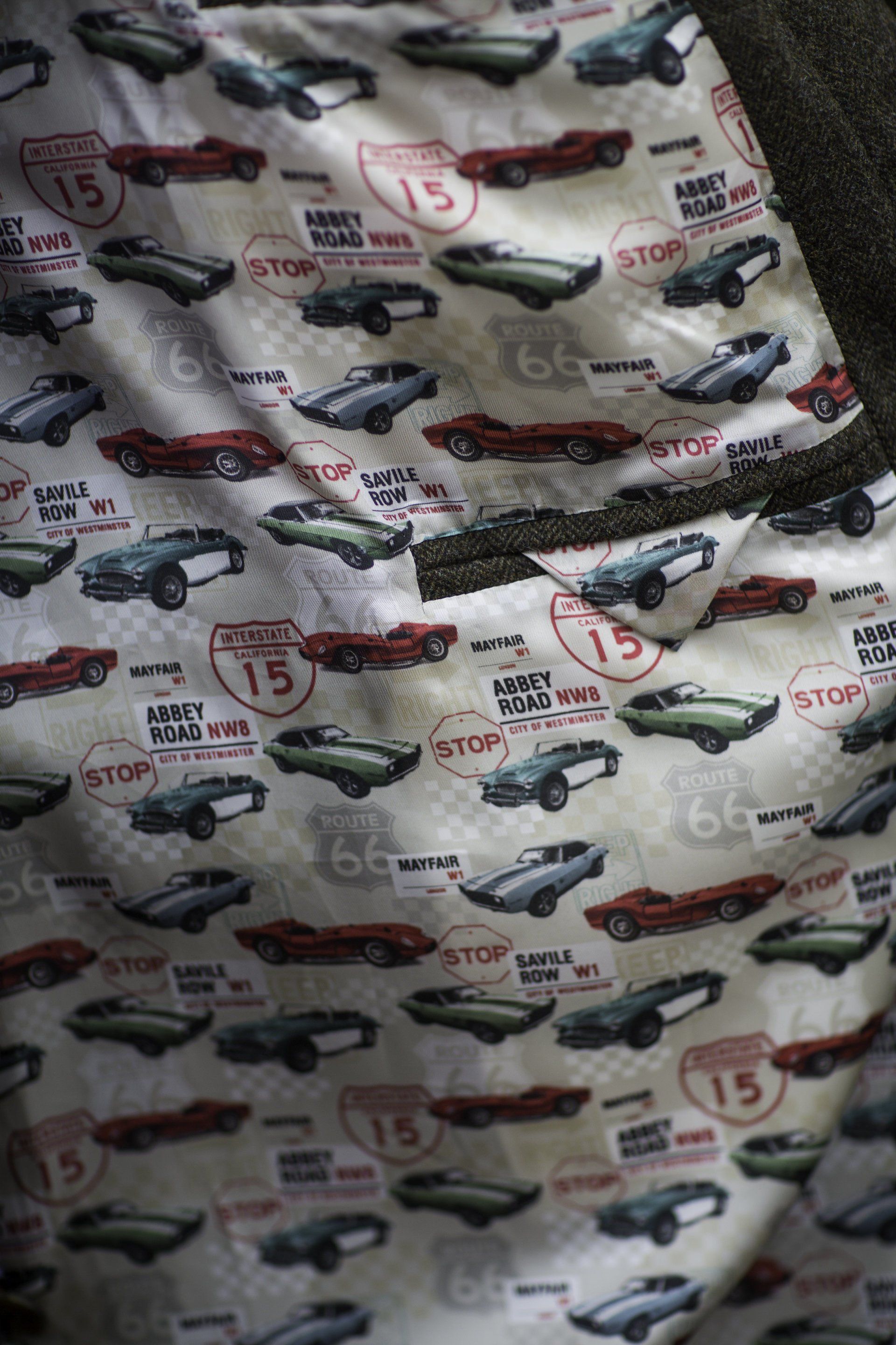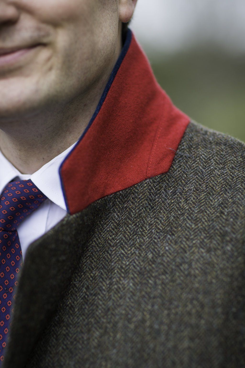 Herringbone Tweed, with Teal Velvet and Red Wood Collar, Vintage Race Car Lining.