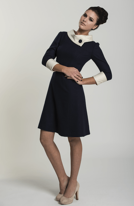 Sweeping neckline and A-line give this dress a structured but feminine shape, flattering on all.