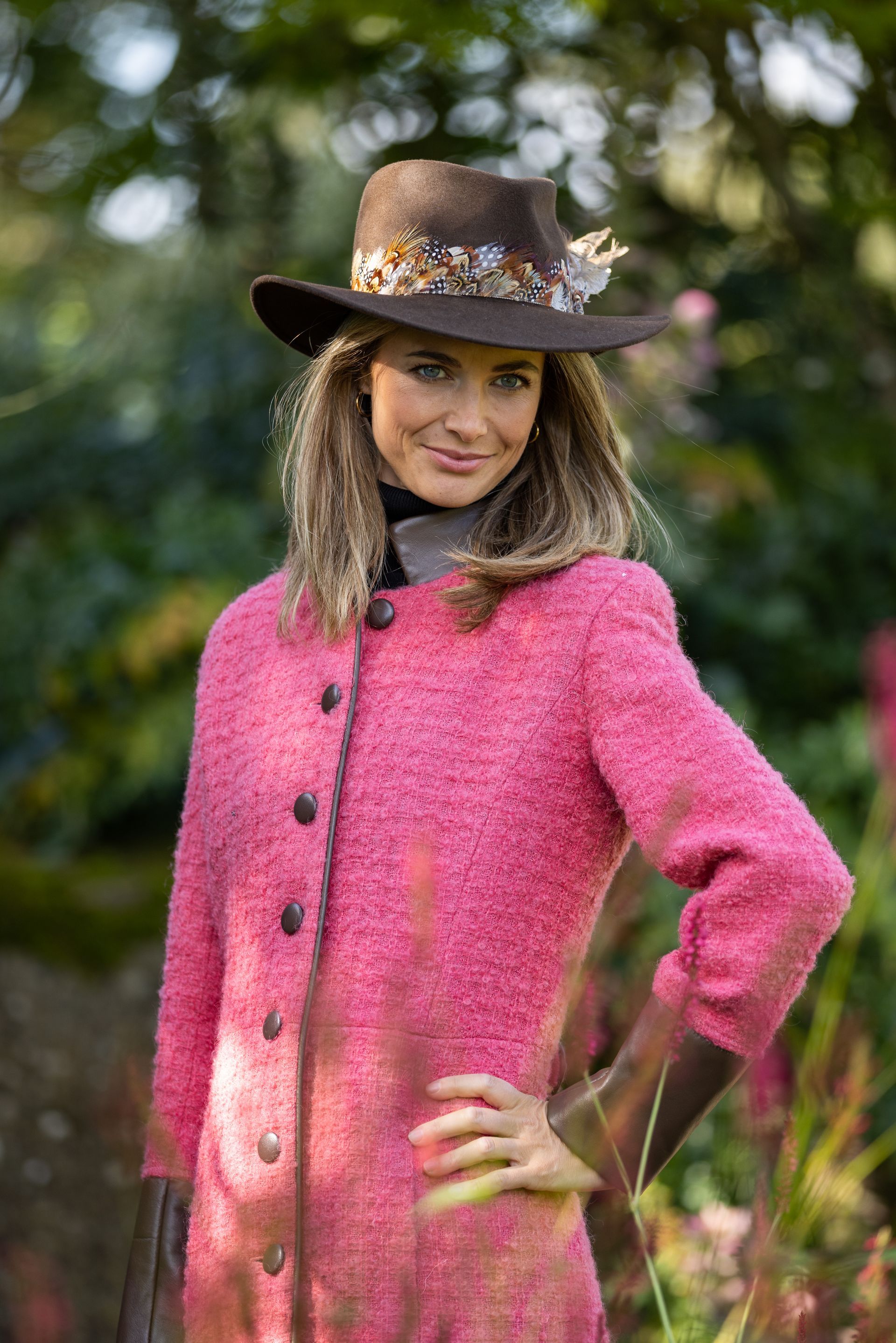 - Wool, silk, velvet, boucle tweed, trimmed with leather