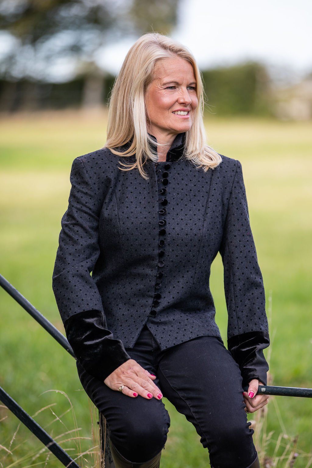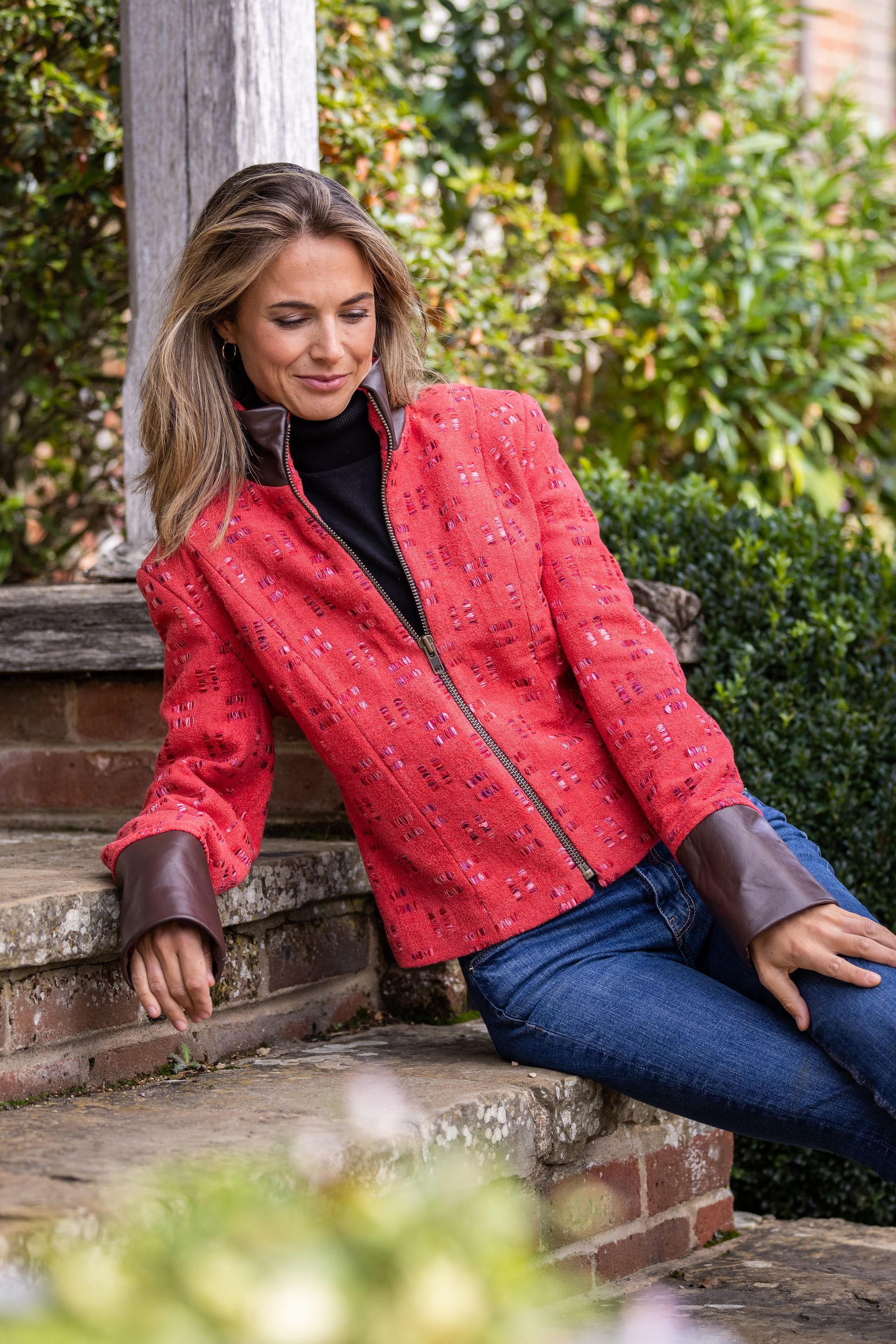 Versatile jacket shown with Matilda skirt two piece suit with seams falling from the shoulders down to waist to flatter. Shown with soft leather cuffs and collar.