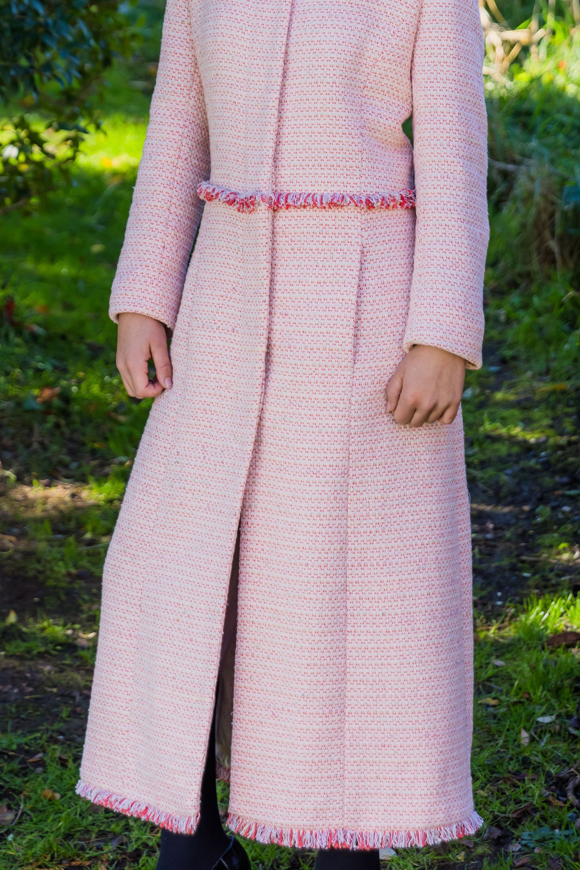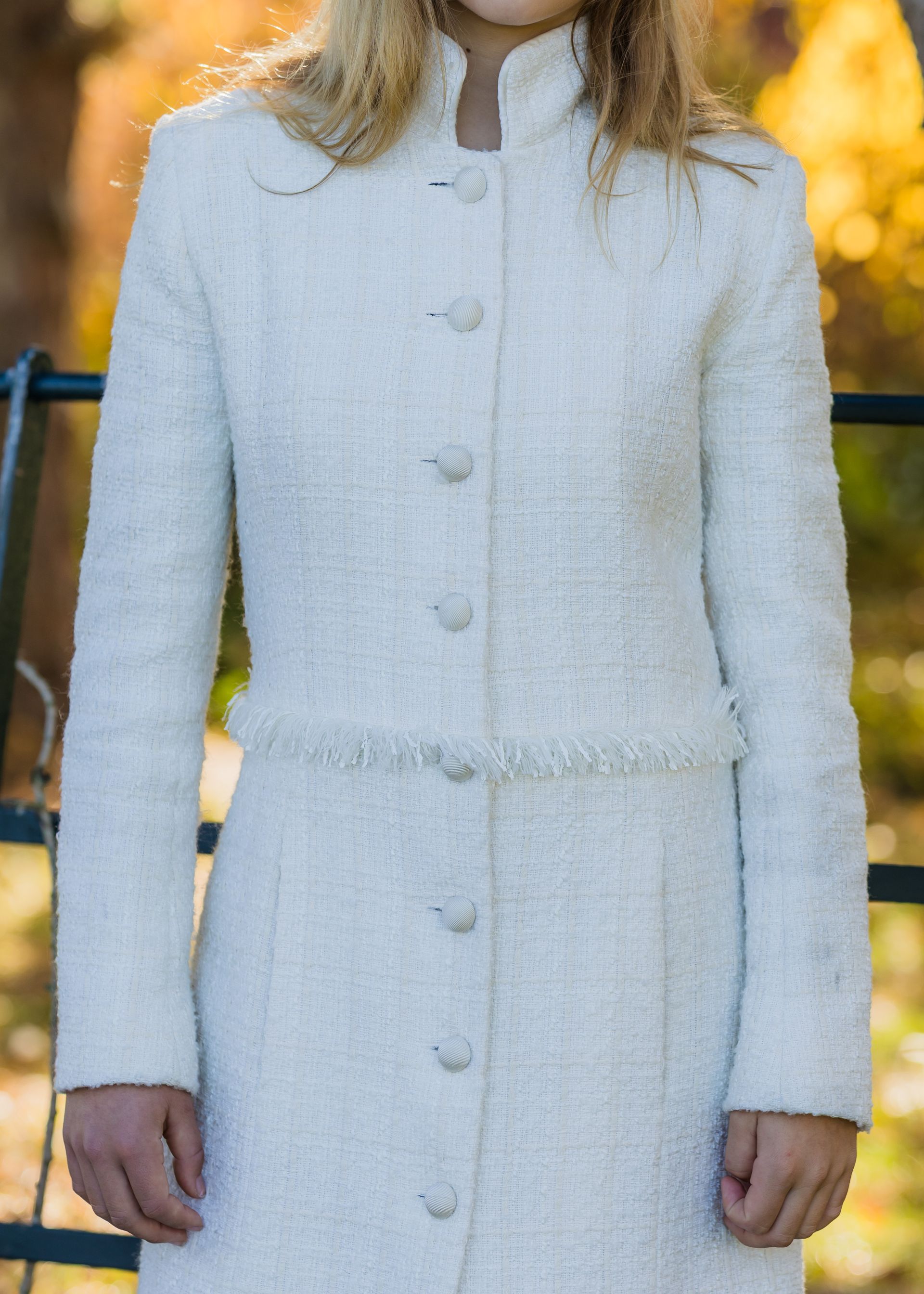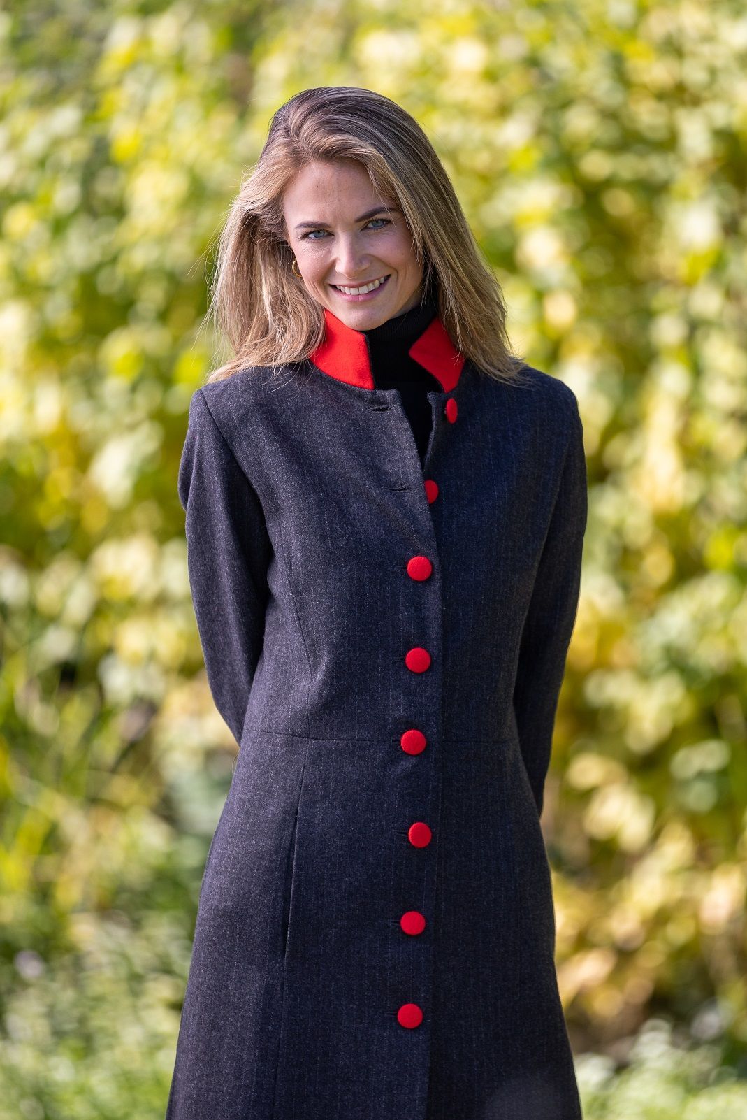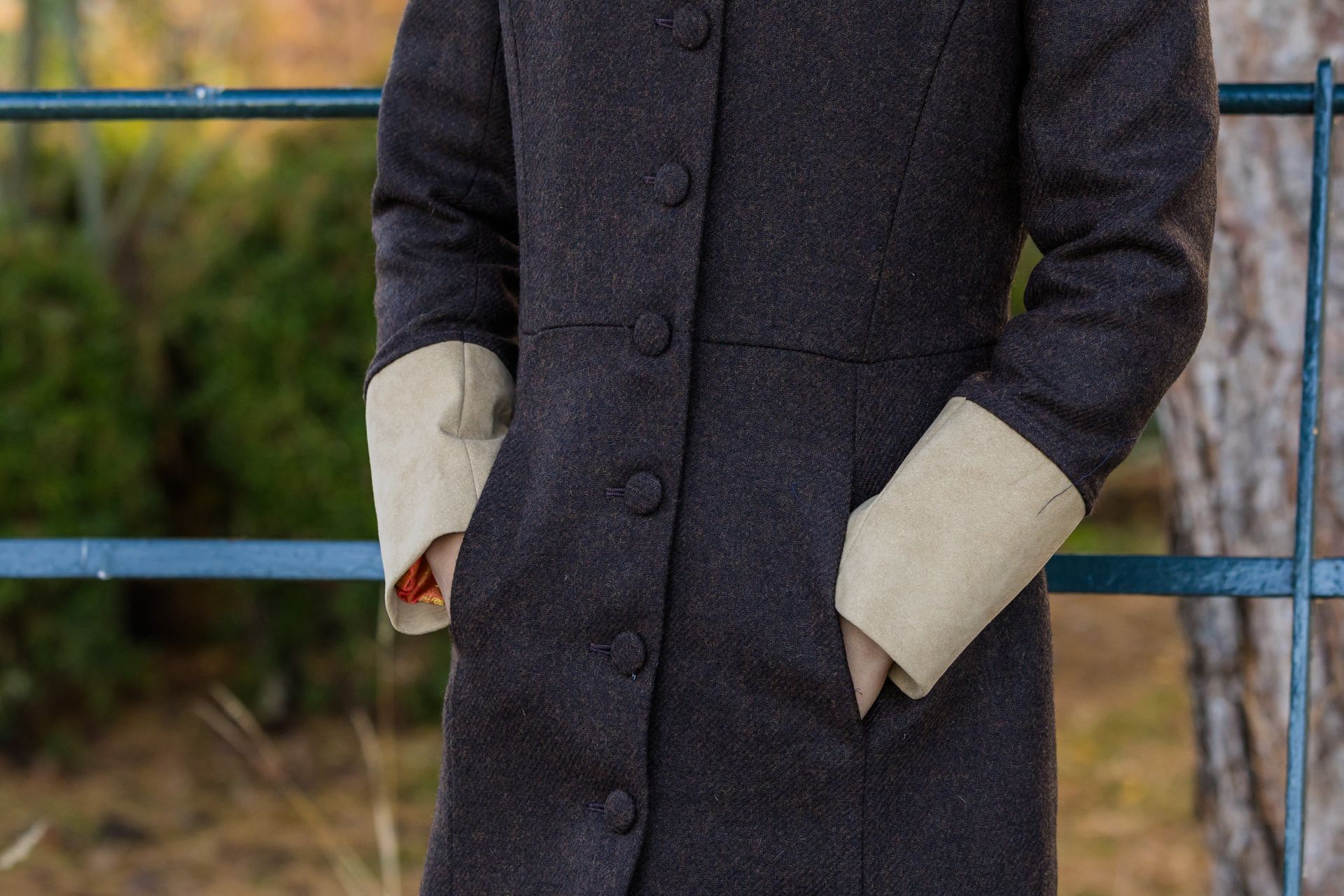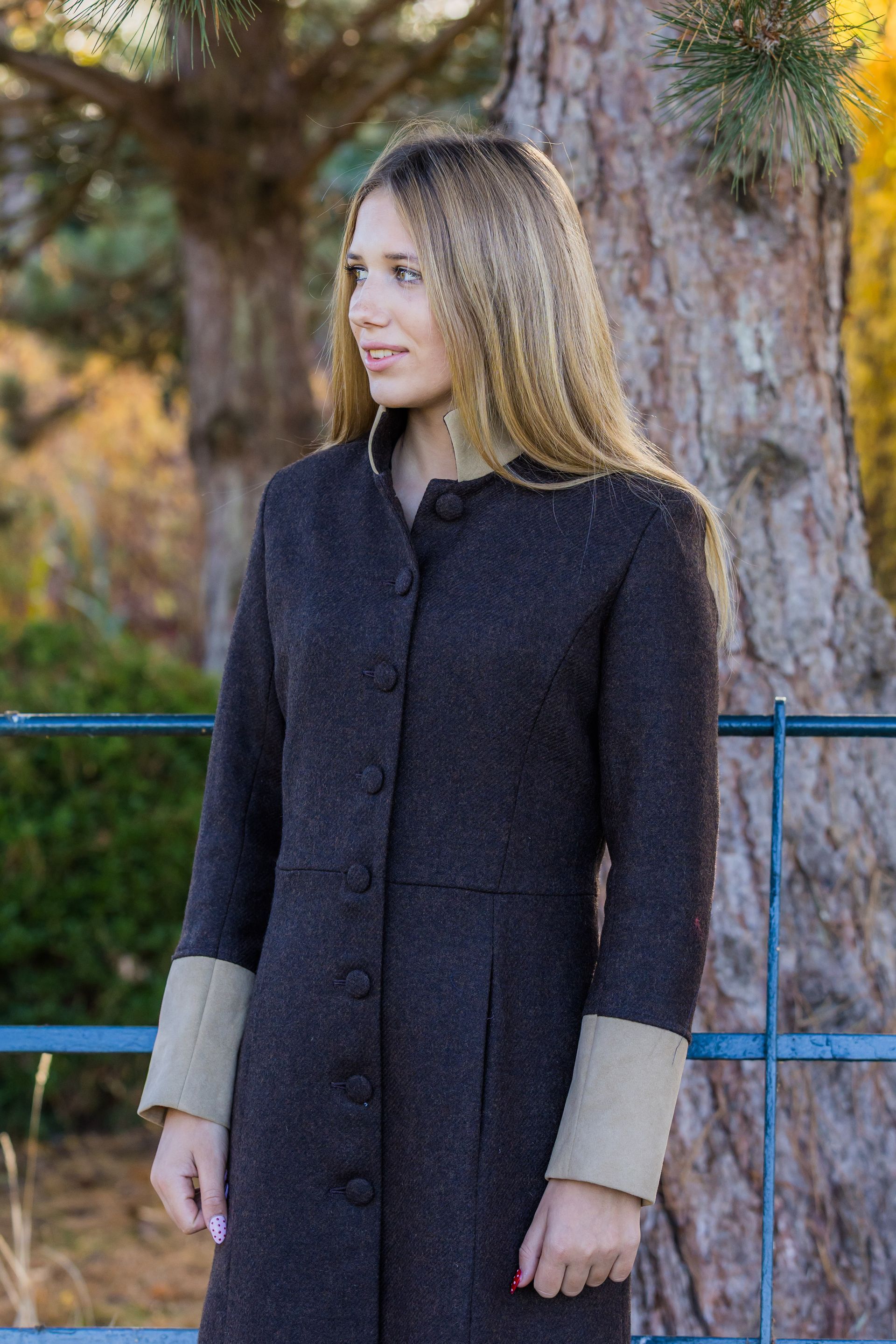 Long and elegant coat with a practical hem line swinging between the knee and ankle. Single breasted with stand up collar.