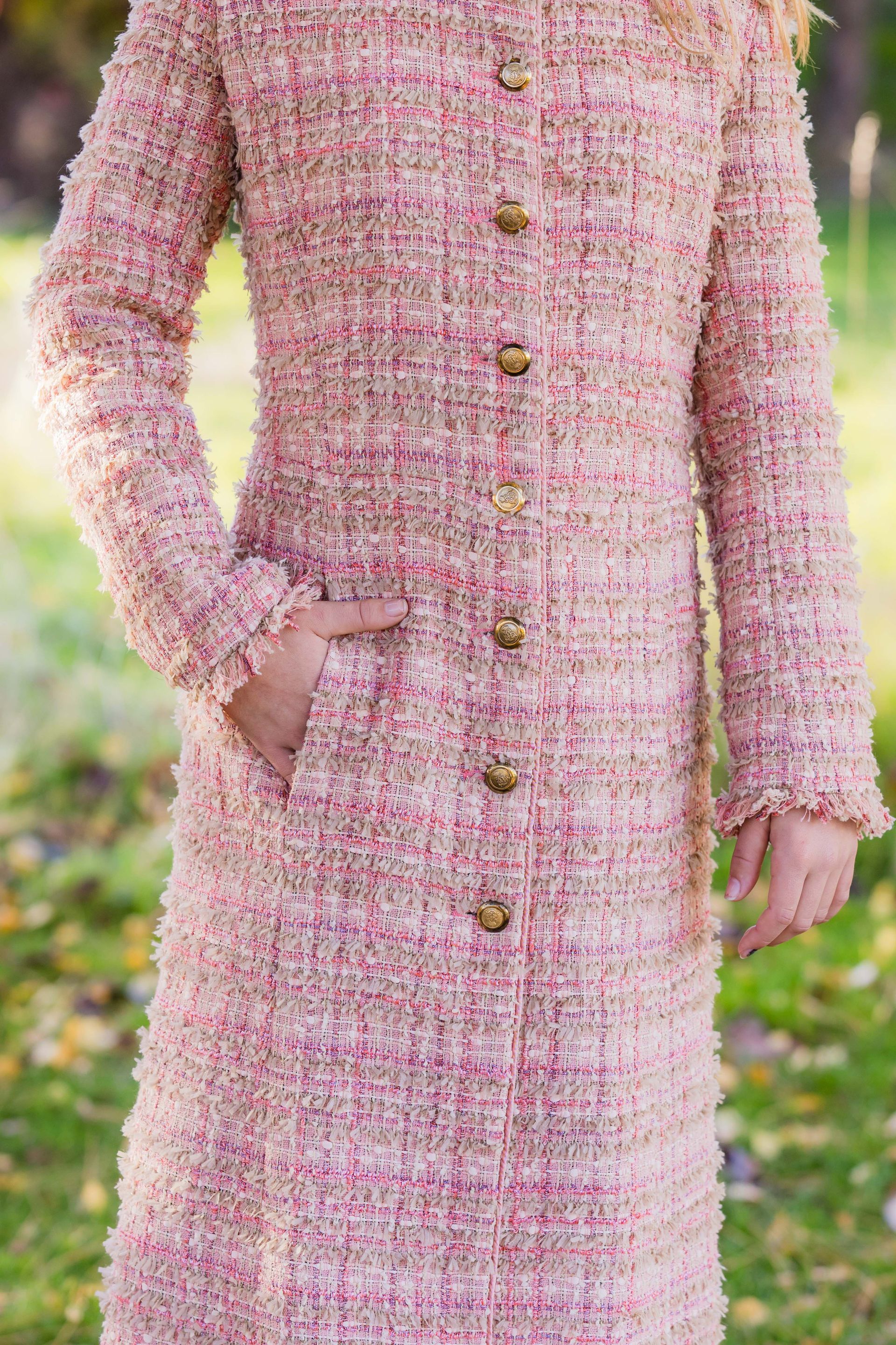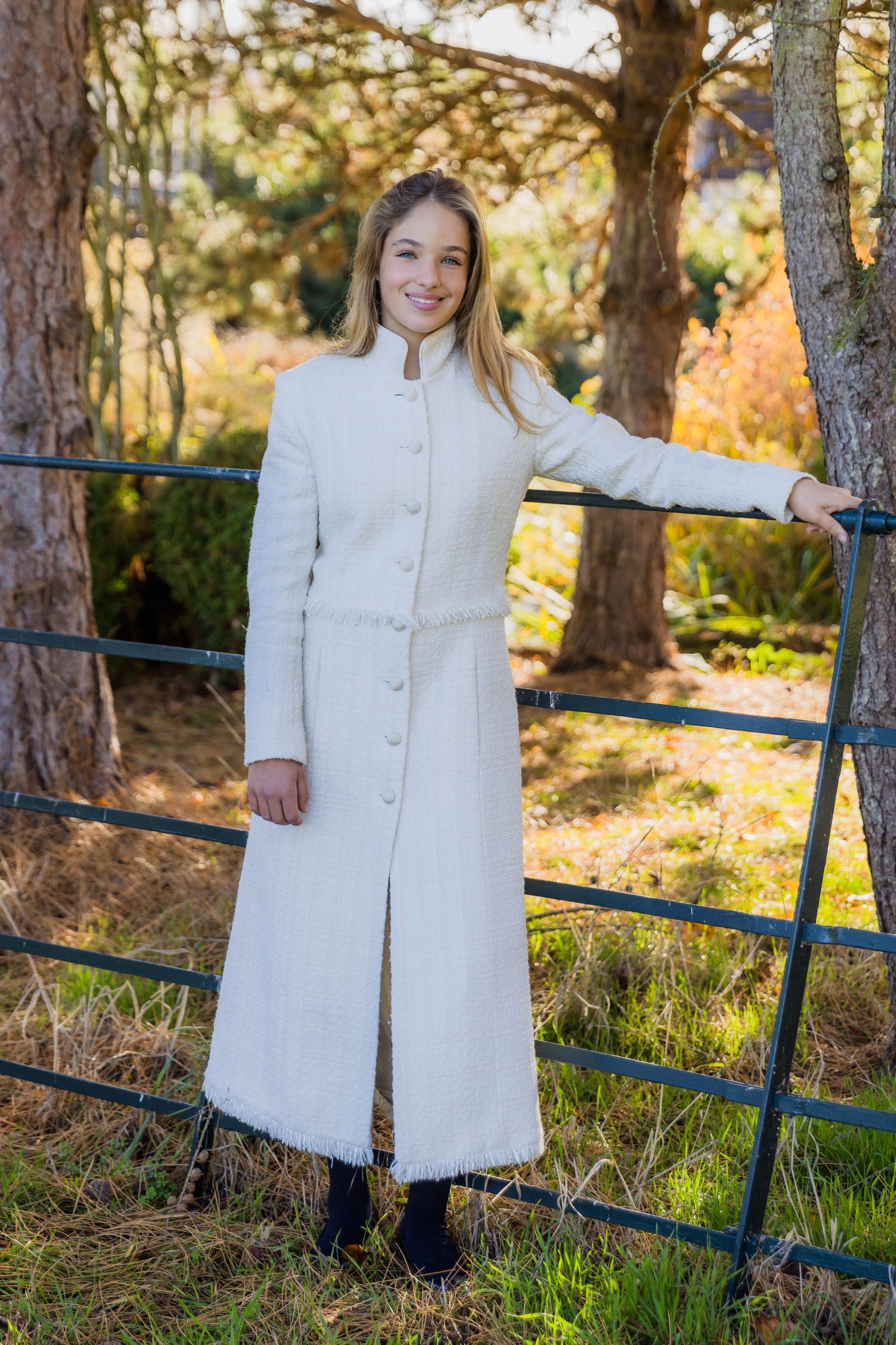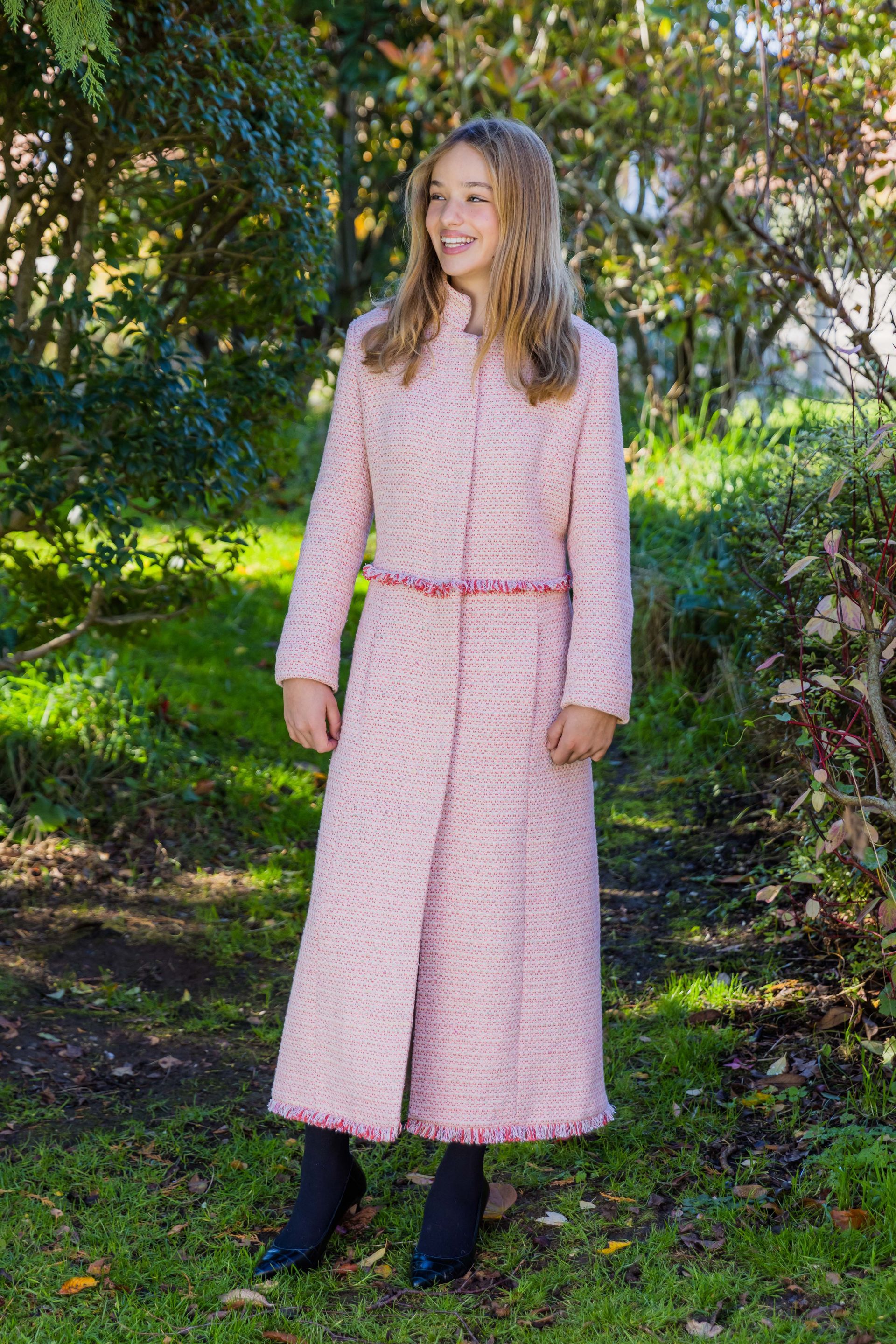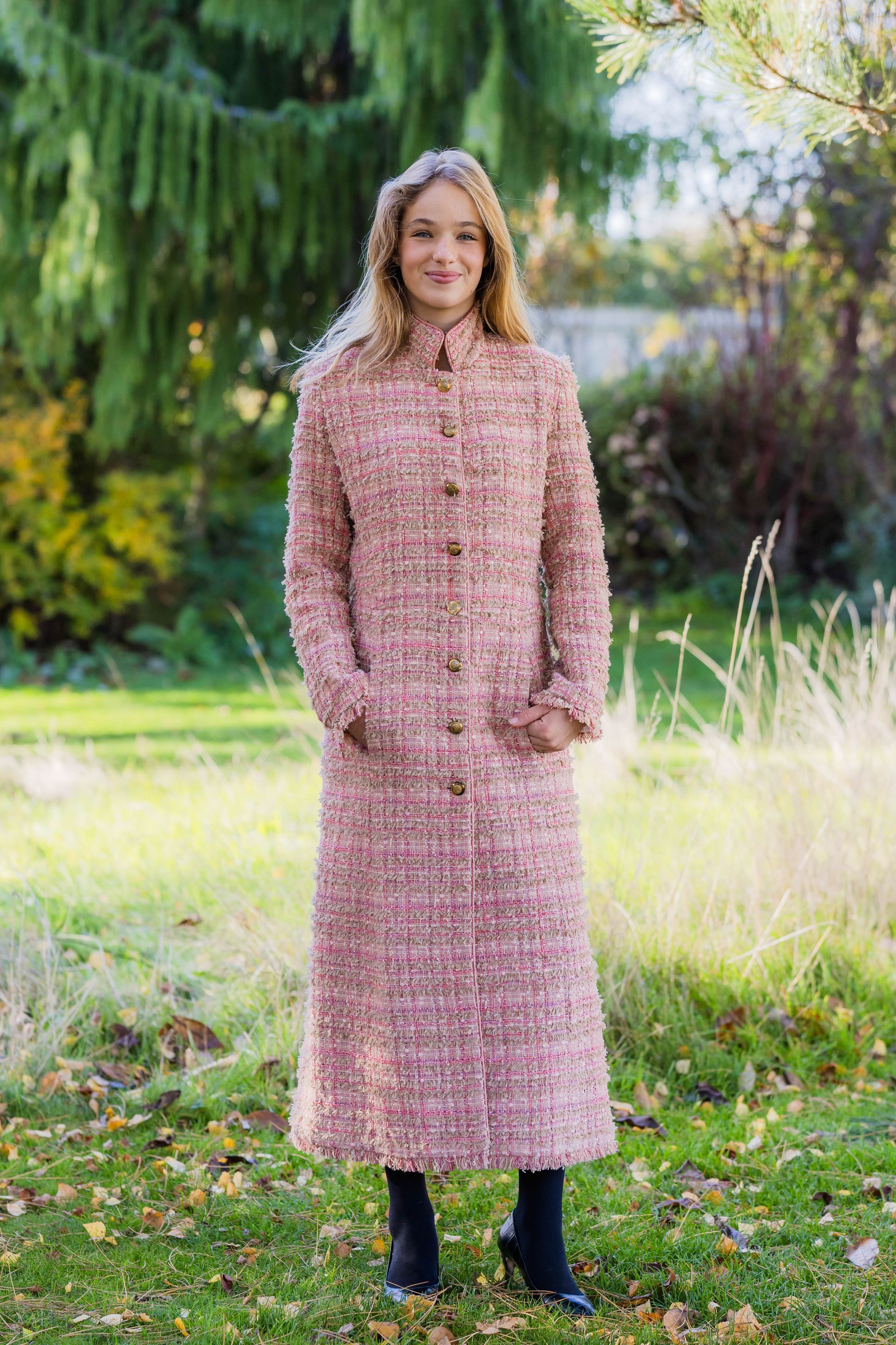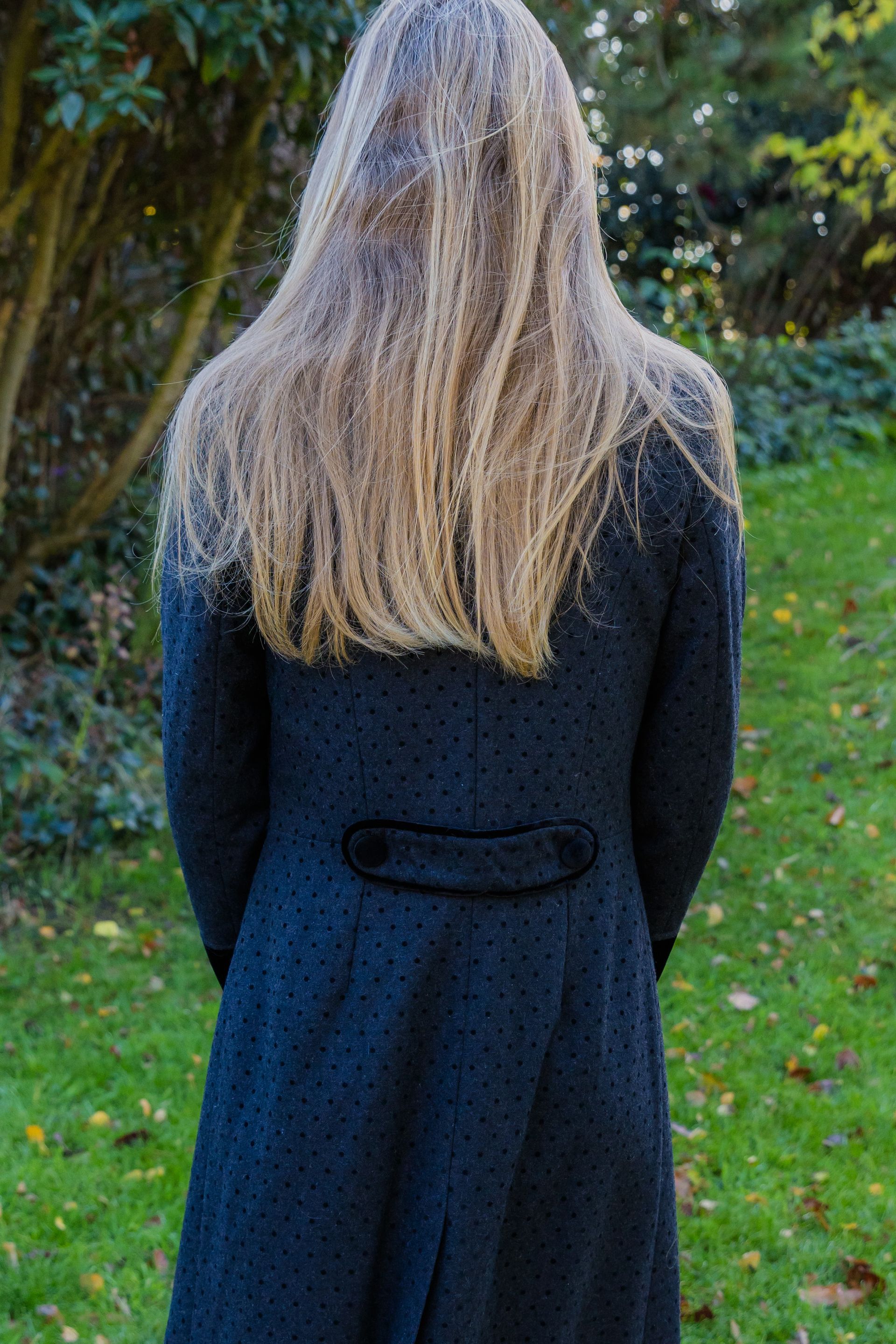 Long and elegant coat with a practical hem line swinging between the knee and ankle. Single breasted with stand up collar.