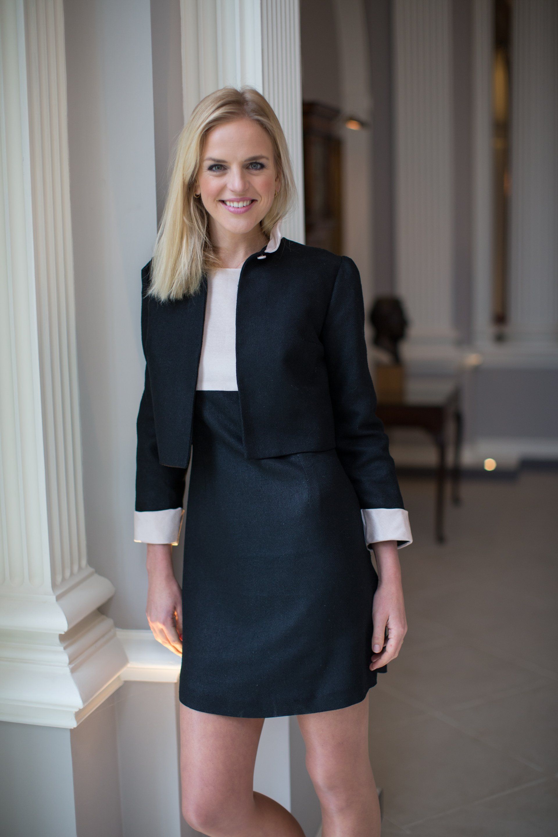 Soft pink and navy grosgrain shift dress, worn with Lilly jacket or on its own.