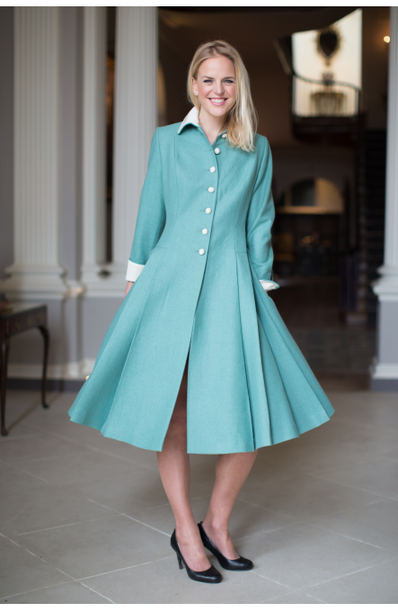 Easy to wear knee length swing coat. Shown with soft leather arms, collar and patch pockets with a chunky brass zip.