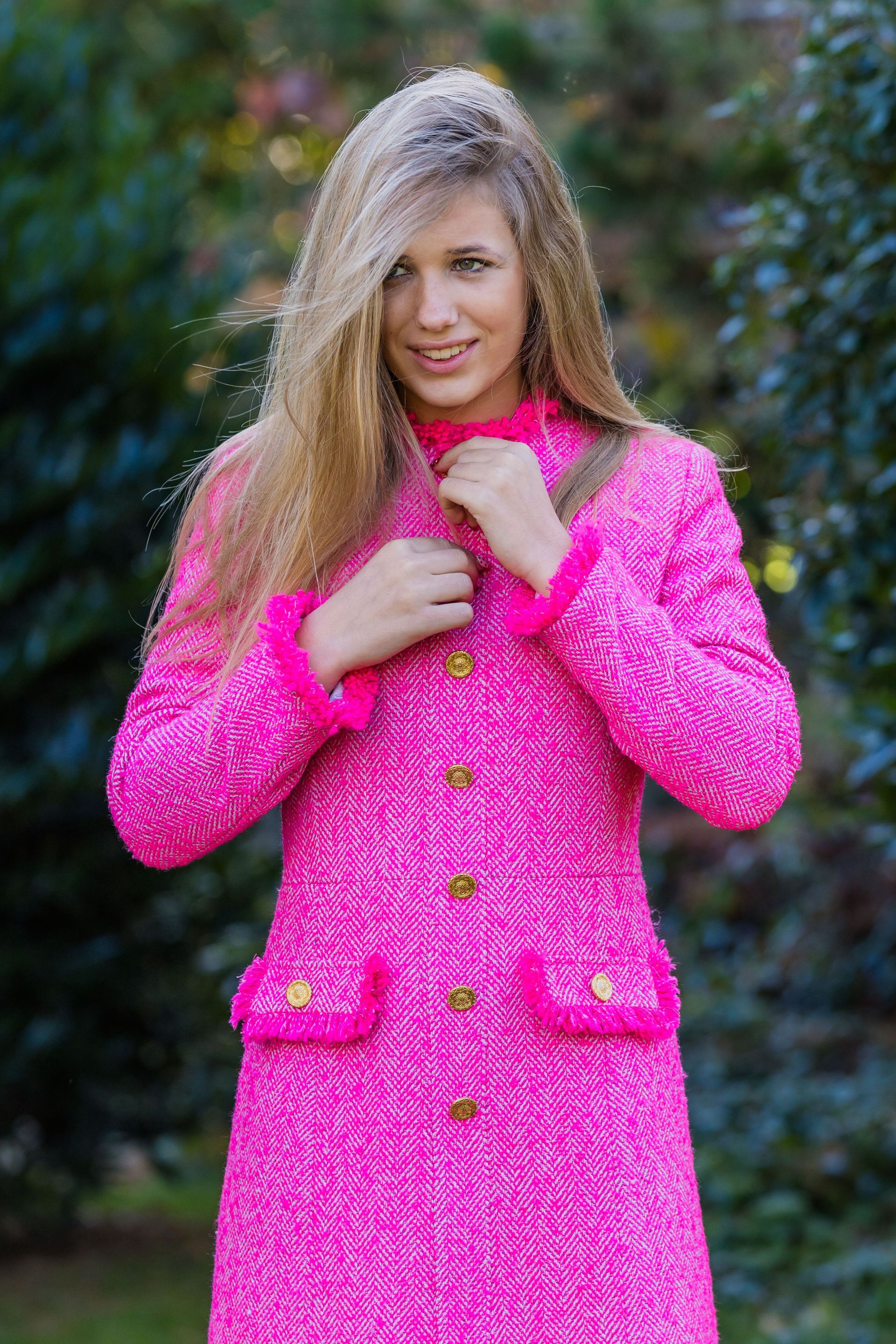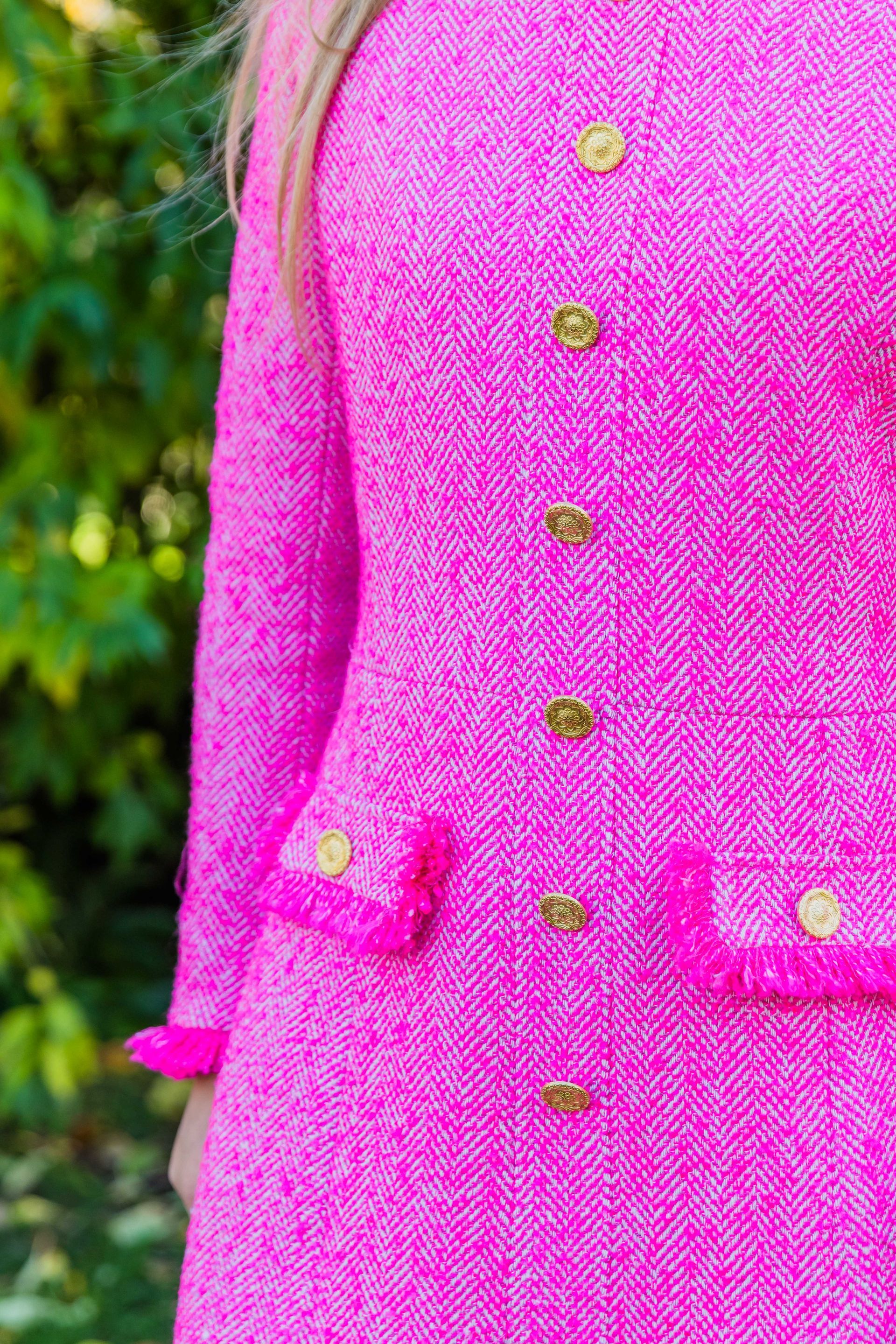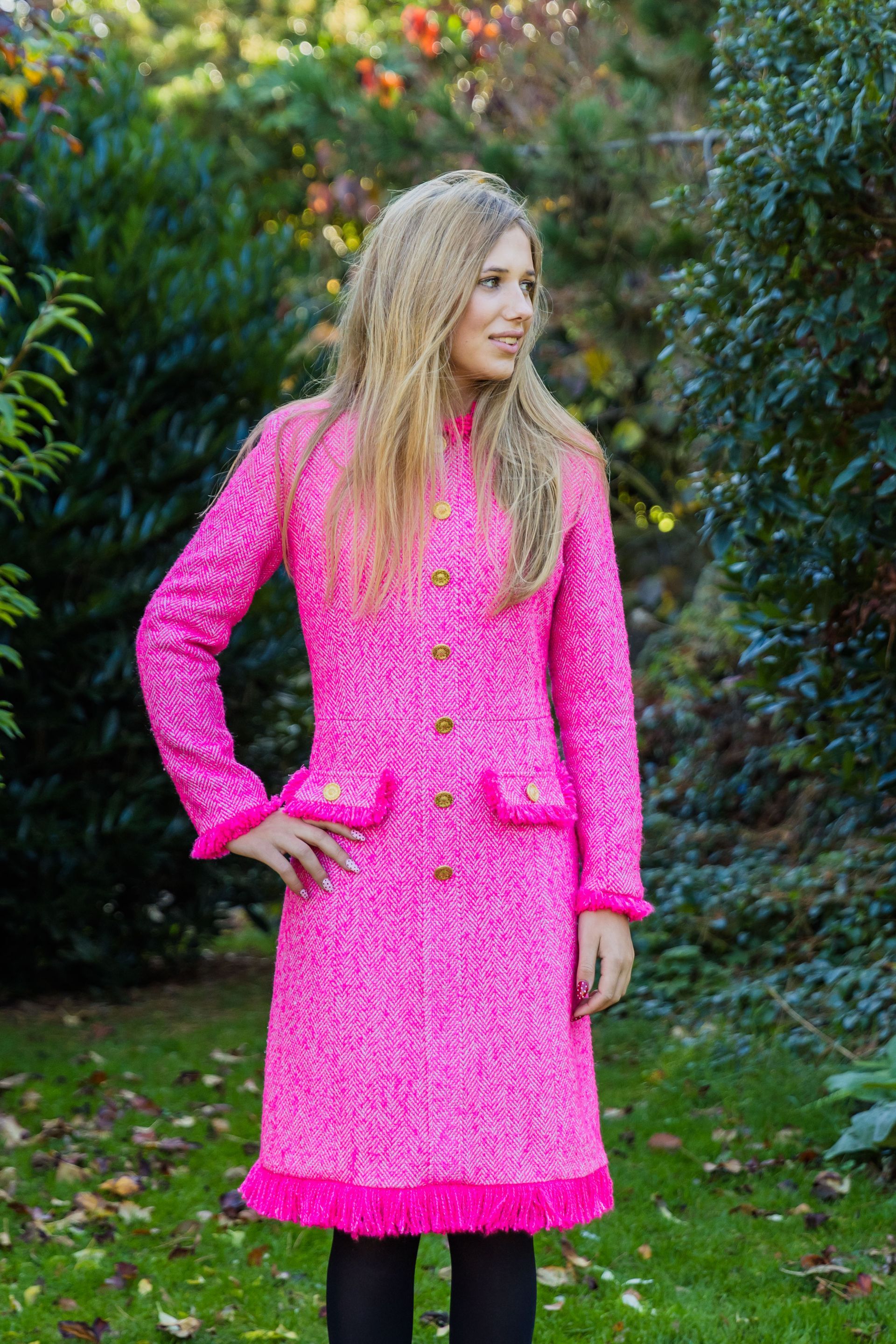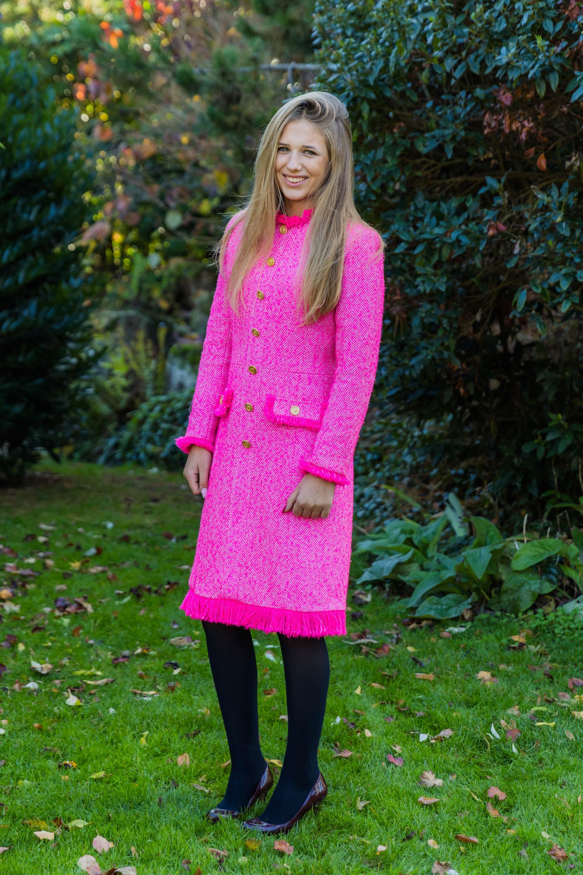 Turn heads in the Tiggy Coat Dress, a statement below the knee design in a vibrant hot pink hue. This elegant piece combines the structure of a coat with the femininity of a dress, featuring delicate frill detailing along the cuffs, hem, pockets and neckline.
