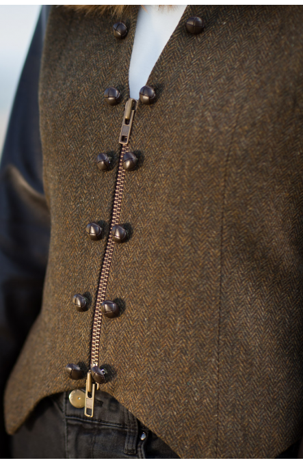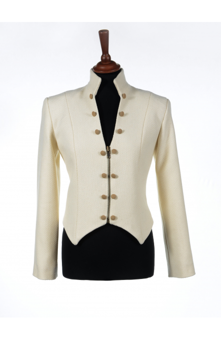 Short, sharp fitted jacket with stand up collar. Fastened with an antique brass zip.